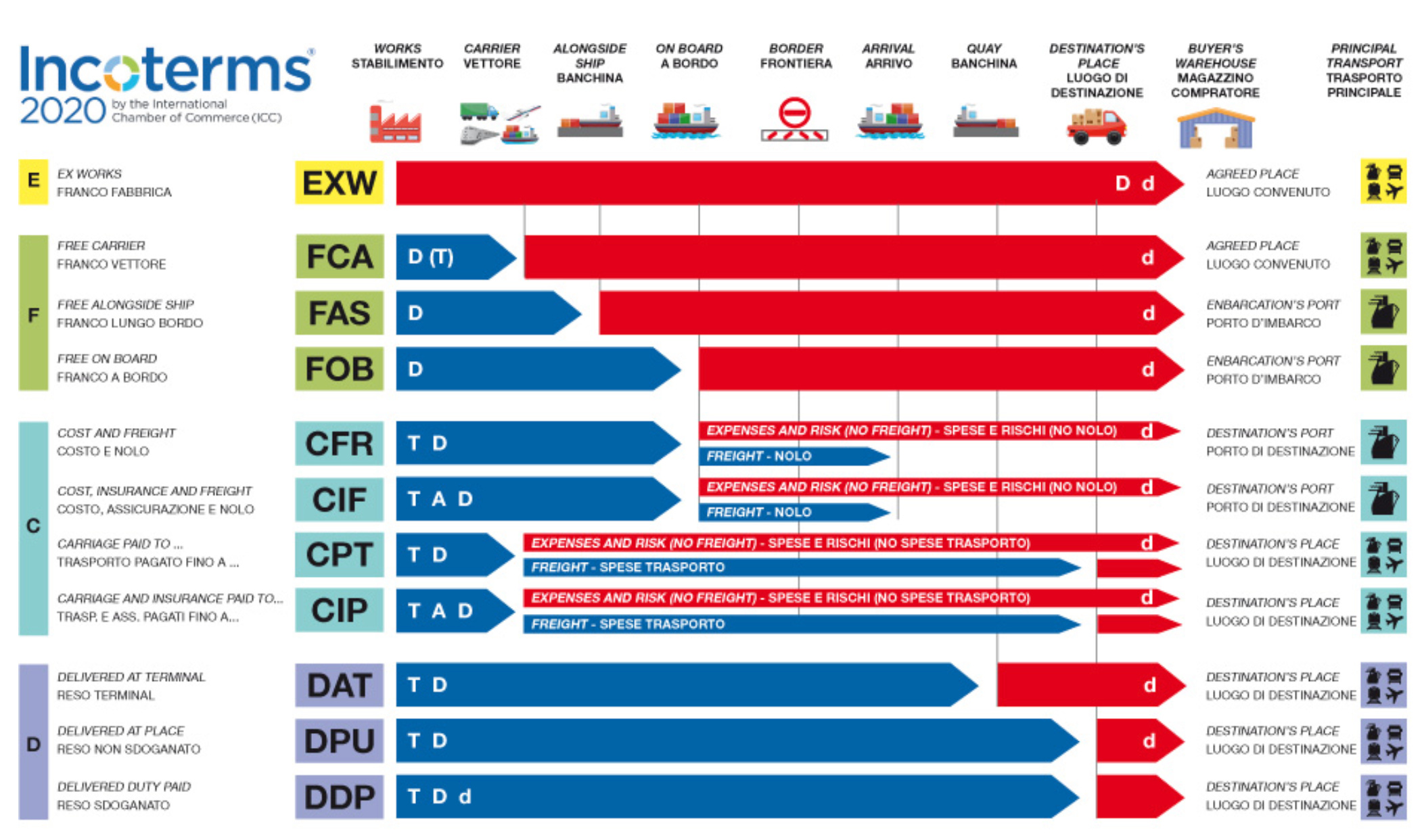Le regole degli Incoterms® 2020 stabiliscono se è il venditore o il compratore ad essere responsabile, e a dover sostenere il costo, di specifici compiti che fanno parte del trasporto internazionale delle merci. Inoltre, indicano quando i costi del trasporto e la responsabilità dell’integrità delle merci passano dal venditore al compratore.